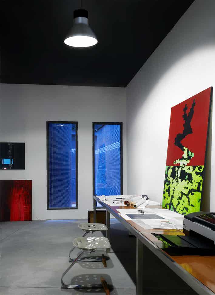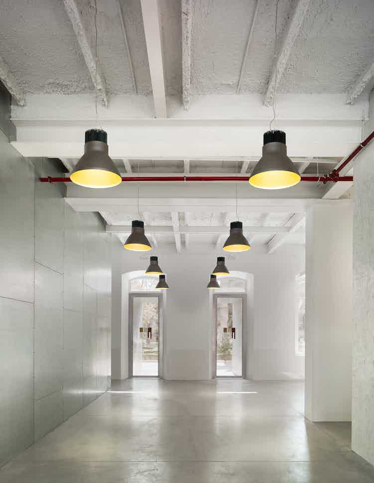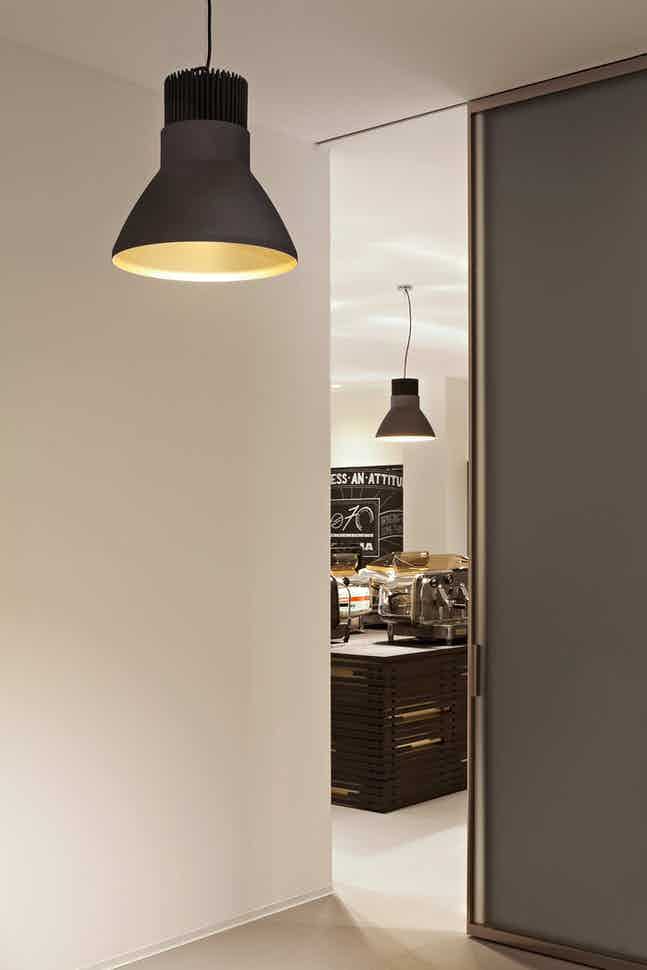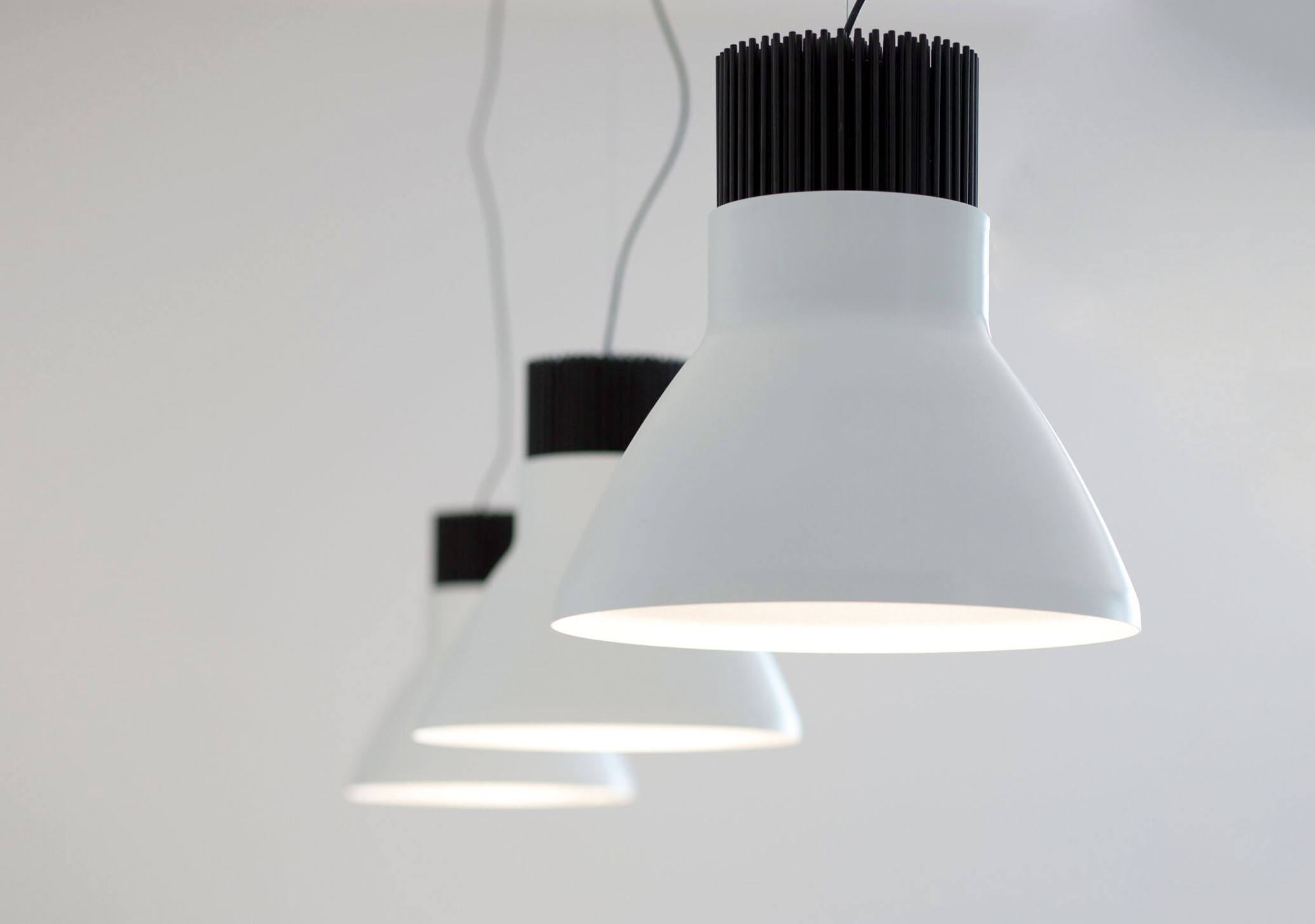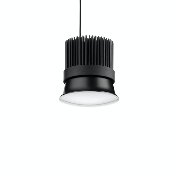 Suspended general lighting luminaire for indoor mounting. It has a high efficiency, latest generation LED light source and a low-loss technical thermoplastic diffuser. The luminaire reflector is made of spun aluminium, available in different patterns inside as well as outside and in transparent glass.