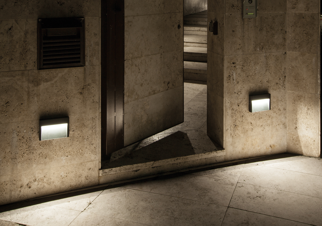 Rectangular, access indicator luminaire with reduced thickness, for wall installation.