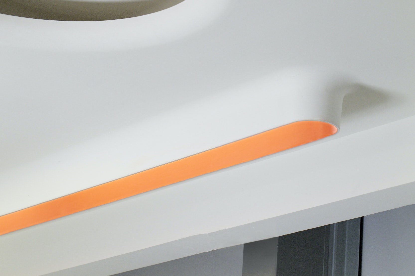 General direct light lighting system. Comprised of Soft Composite modules that permit ceiling mounting and which house fluorescent lighting modules, thus guaranteeing uniform, shadow-free lighting. Inspired by the Flos architectural Kap luminaire, the inside of the Kapprofile can be painted, offering different décors.