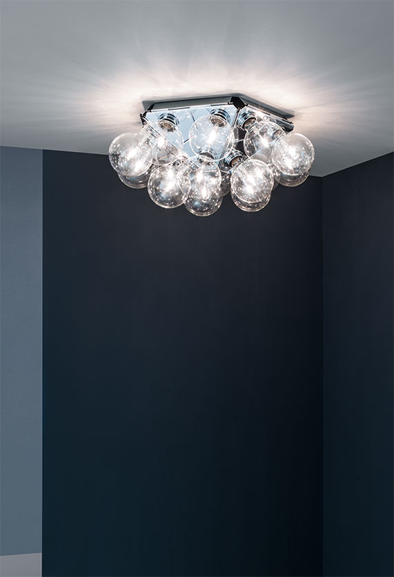 Wall/ceiling lamp providing direct and reflected light. Structure formed by 5 pressed polished aluminum triangles. 15 clear Globolux lamps housed around the structure. Steel wall/ceiling fitting and rose.