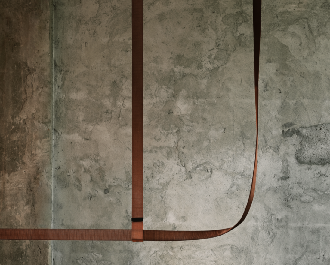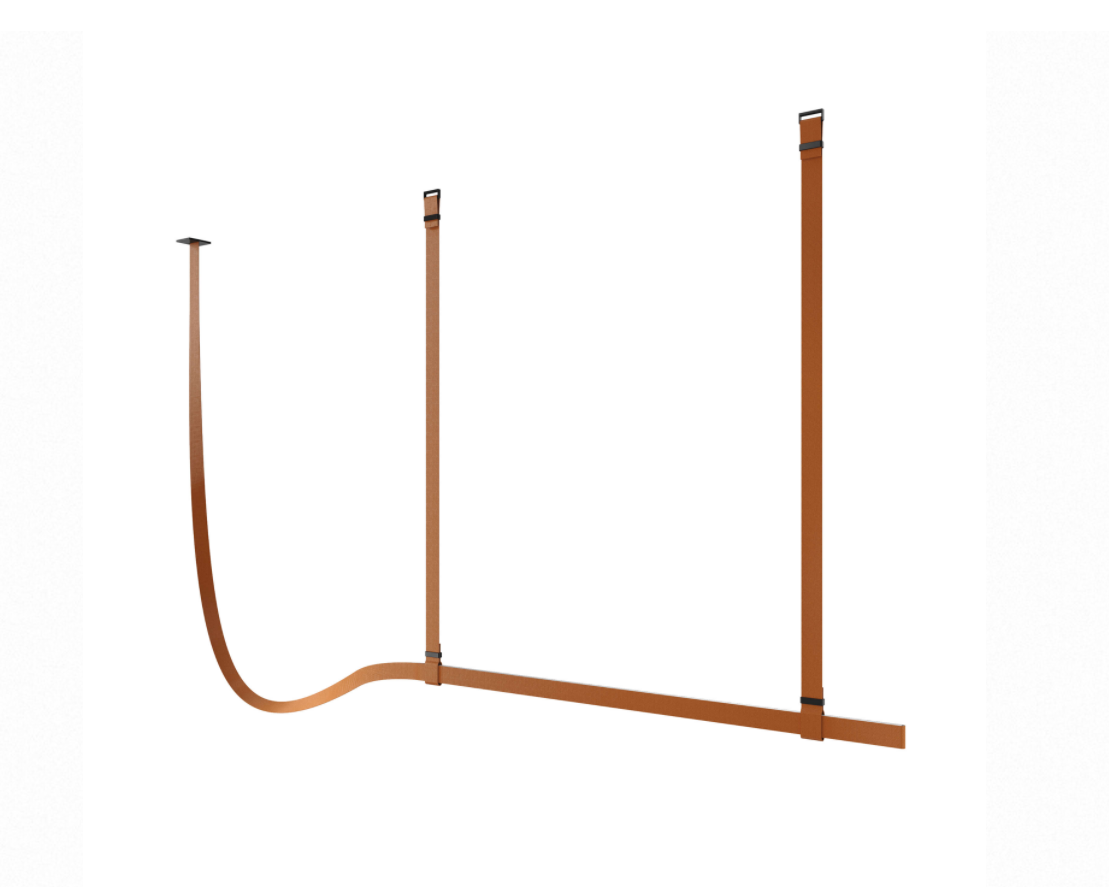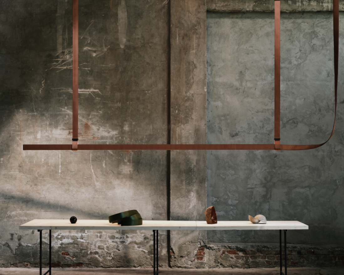 This iconic profile for suspended installation features refined leather or fabric surfaces developed specifically for Flos. Belt is pure flexibility, a sinuous line that creates a balance between the softness of leather or fabric and the rigidity of aluminium. The soft part is represented by the connection to the electrical network, while the rigid parts correspond to the light source, the long lines of light. The fixture is equipped with integrated direct and indirect lighting and each light source can be controlled individually via remote control. The product is installed with the use of leather or fabric straps to hang the lighting profile, sliding the straps through dedicated metal clasps that act as hooks on the ceiling. Each strap may be regulated to match the shape of the environment. A special microconnector integrated into the terminal of the lighting profile allows for electrical connection through a simple snap. The electrical connection is hidden within the leather or fabric straps, which supports the composition. Profiles available in leather (black, natural leather and green finishes) and fabric (grey olive and copper brown finishes). Electrical system powered at 48V dimmable with CASAMBI controller integrated inside the fixture. To manage the system it is necessary to download the FLOS Control? powered by Casambi app (available on Apple Store and Google Play).