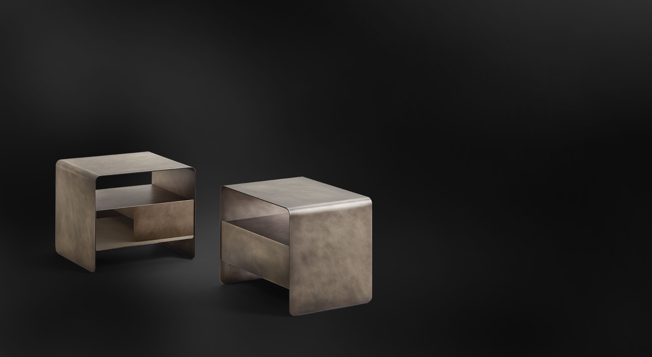 一塊搭配啞光金屬色、鐵銹色或黑色飾面的簡潔金屬板輕柔地彎曲,金屬板中有一個幾乎呈懸浮狀的空間,一個配有抽屜的儲物層,以及一塊支撐面。
