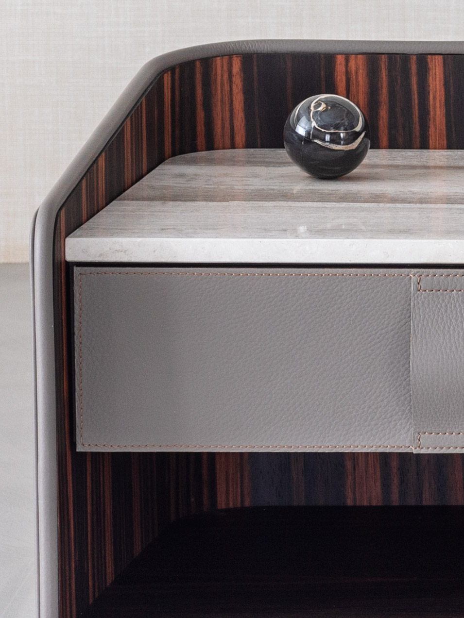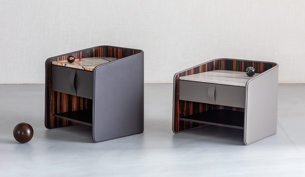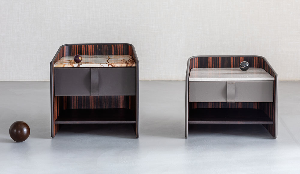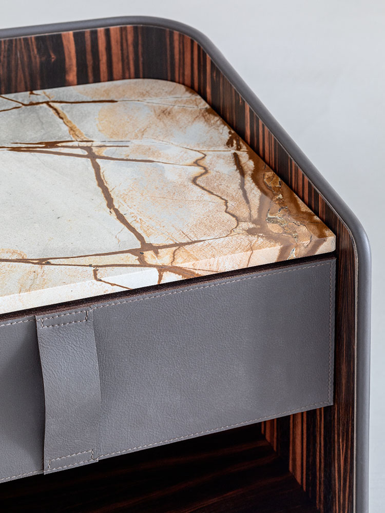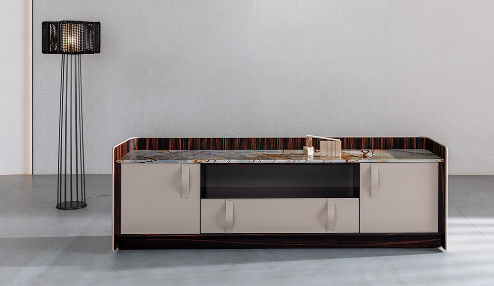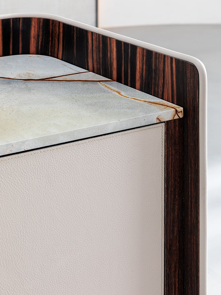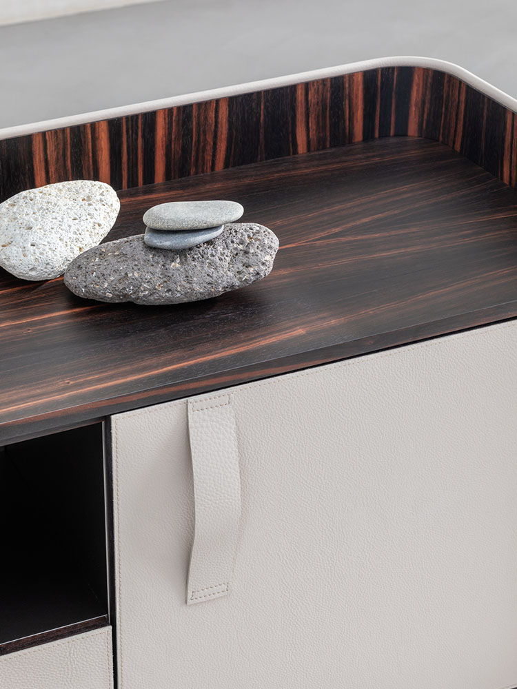 Gentleman餐具柜由兩扇門、抽屜和開放式隔層組成,內部為烏木,外部為新款羅馬帝國大理石。這款大理石精選自巴西,表面有不規則的紋理,暖色系焦糖色。它是以工匠技藝精心打造的珍貴材料,傾注了我們的熱情、精細和對細節的極致追求。這也就是為什么Gentleman系列的每件作品都可被譽為“獨件”。