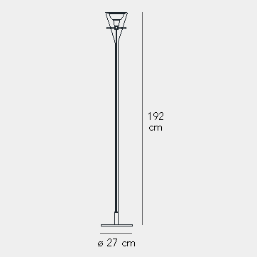 Un cono di vetro alloggia il riflettore in alluminio cromato, sorretto da tre aste sottili in metallo. Equilibrio e leggerezza per questa famiglia di lampade disponibili nella versione da terra e parete per una emissione di luce indiretta e a sospensione, per una emissione di luce puntuale e diretta.