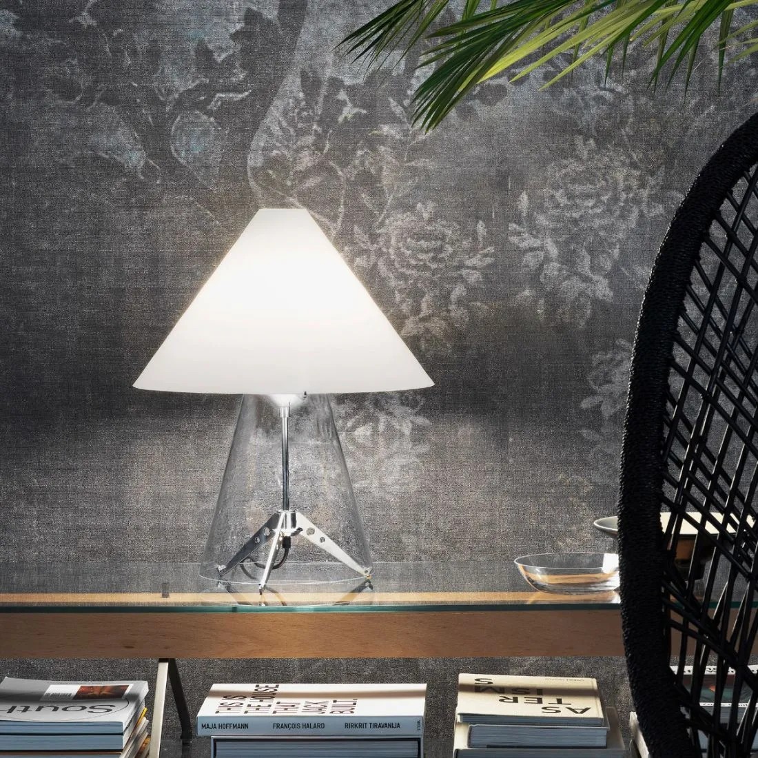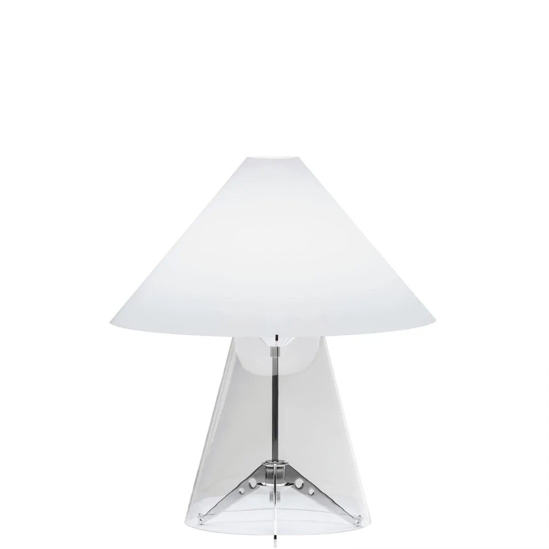 Metafora nasce nel pieno clima creativo dei primi anni 80, quando Gae Aulenti assume il ruolo di direttore artistico all’interno di FontanaArte e decide di riportare il vetro al centro dell’attività dell’azienda. Chiamato da Gae Aulenti, Umberto Riva disegna una lampada da tavolo preziosa, composta da un diffusore conico a strati di vetro opalino, sorretto da una base in vetro trasparente che cela la struttura in metallo, tutta a incastro. Un oggetto di natura fortemente decorativa, prodotto con tecniche produttive tradizionali come la soffiatura a bocca del vetro, tipiche del sapere fare artigianale, oggi riproposto ad un pubblico sempre attento all’originalità del design e alle sue espressioni timeless.