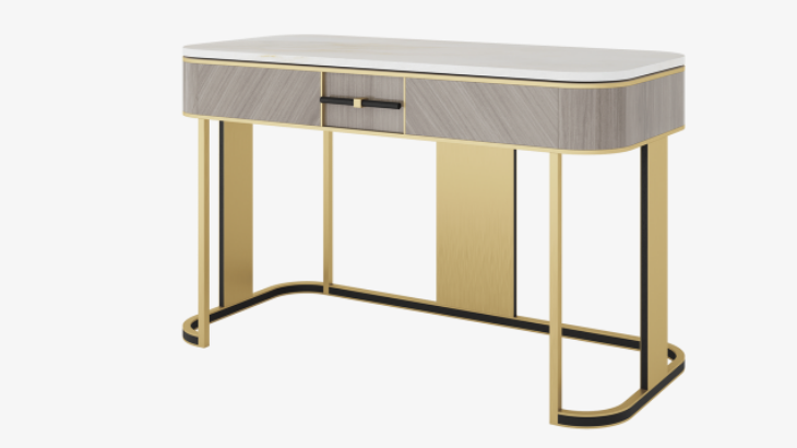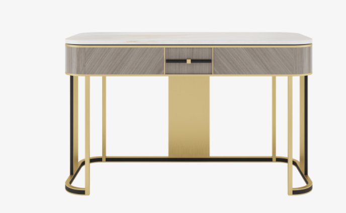 A functional and streamlined workspace solution, the ASHI desk will aid productivity and concentration. A luxurious blend of brass, solid wood and veneer, the design is finished with a seamless, sinuous surface of white marble that will elevate your workspace.
