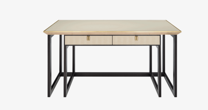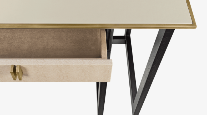 A design worthy of future heirloom status, the BALI desk is a sophisticated home office solution. Notice how the sculptural dark wood base showcases twin suede-lined drawers and a surface finished in textured leather and brushed brass.