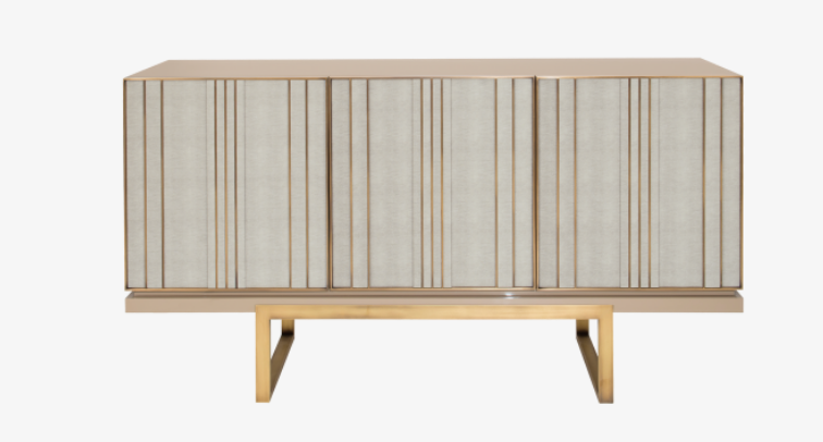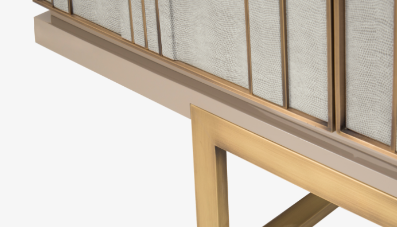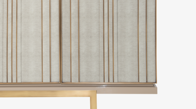Part of a three-piece storage collection, the alluring ASCOT sideboard features a box of glossy lacquered wood and a metallic base. Three doors inlaid with leather and featuring irregular brass stripes add an unexpected rhythm to the design