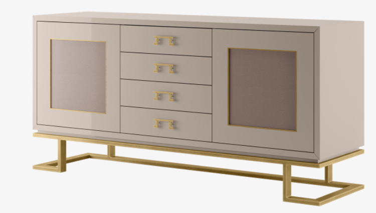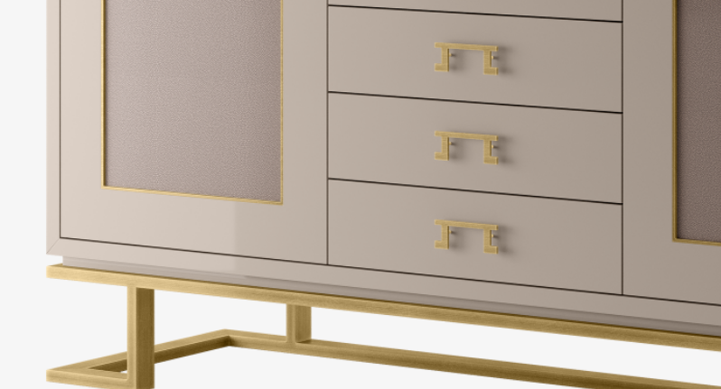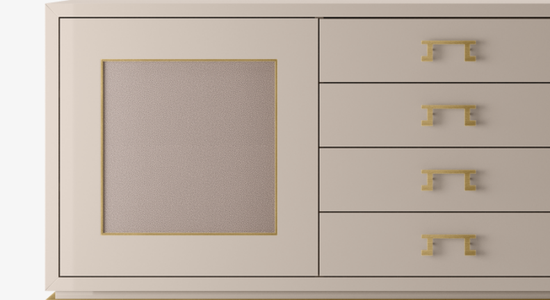An evolution of our NAJA sideboard, the NAJA II integrates four drawers and two doors into its streamlined silhouette. Touches include original handles, leather inlays and a sculptural base seamlessly crafted from brushed brass.