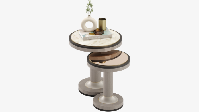 The simple, chunky pedestal form of the CALGARY side table focuses the attention on the beauty of the expertly layered materials, which include stone, brushed brass and contrasting shades of wood veneer. Place alongside a sofa or use as a pared-back bedside companion.