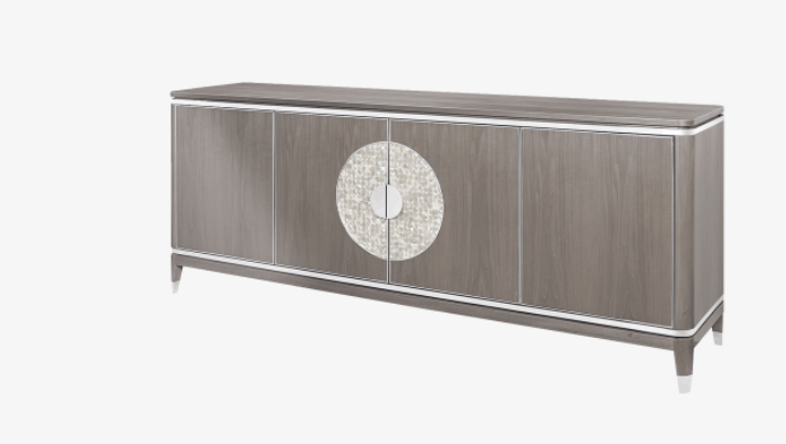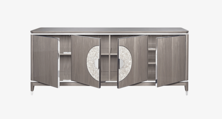 The striking SEVILLE sideboard uses elegant materials to elevate a pared-back silhouette. Crafted from glossy wood veneer, details of brushed brass and a circular inlay of white mother of pearl catch the light and the eye.
