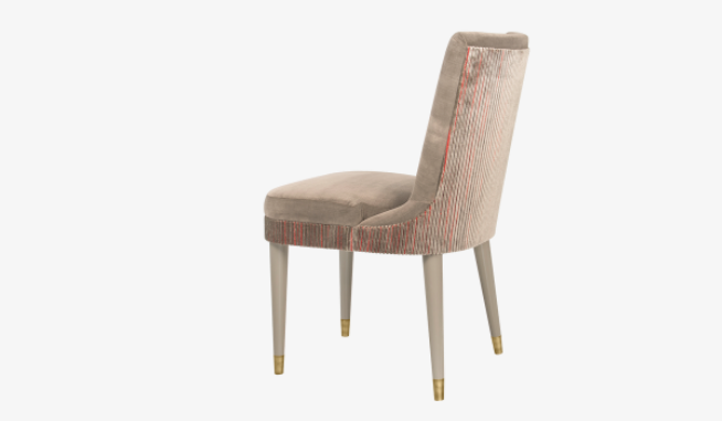 The HAIA dining chair will bring comfort and a splash of colour to your space. Its minimal silhouette is enlivened with a plain and striped velvet, while lacquered wooden legs are capped with brushed brass.