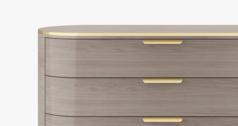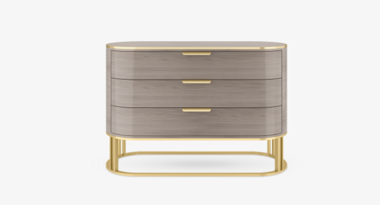 A gently curved oblong shape, the sinuous DALLAS chest of drawers design is crafted from high-gloss veneer with accents and an architectural base in contrasting brushed brass. Its three drawers feature simple pull handles and open to reveal suede-lined interiors.