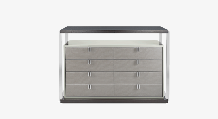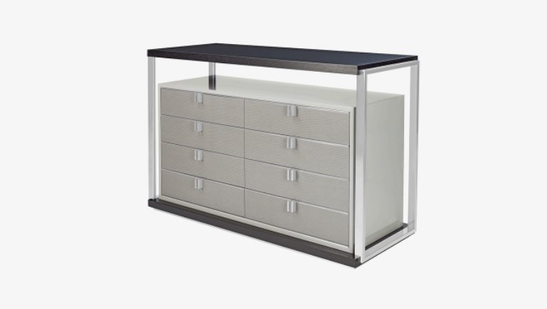 Part of a three-piece storage collection, the alluring LEXTON chest of drawers plays with the idea of a design within a design, featuring a box of glossy wood veneer incorporating eight drawers with polished steel handles, leather fronts and suede interiors. Around this, an interlocking structure of veneer and metal adds additional surface space and instant wow factor.