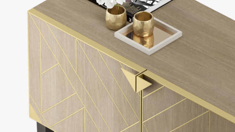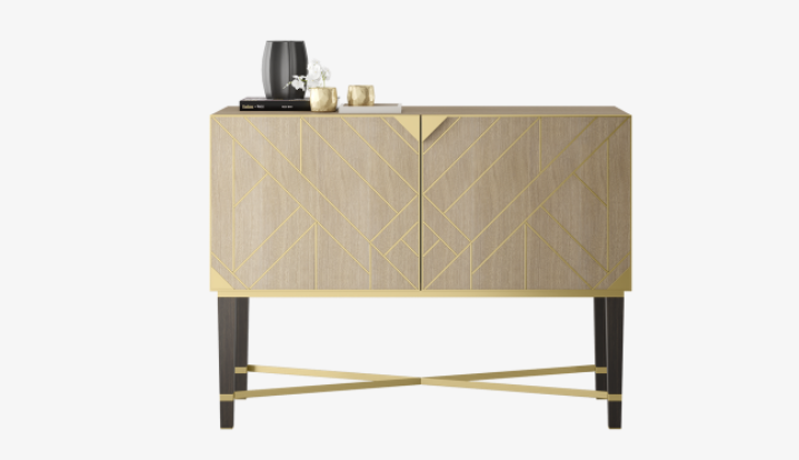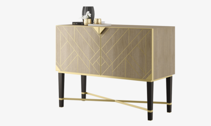 Resembling a bijou sideboard, the stylish SIRMIONE cupboard brings the drama to storage. Wood veneer double doors feature an Art Deco-style pattern created with brushed brass, while an X-shaped leg brace create visual interest below.