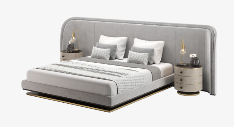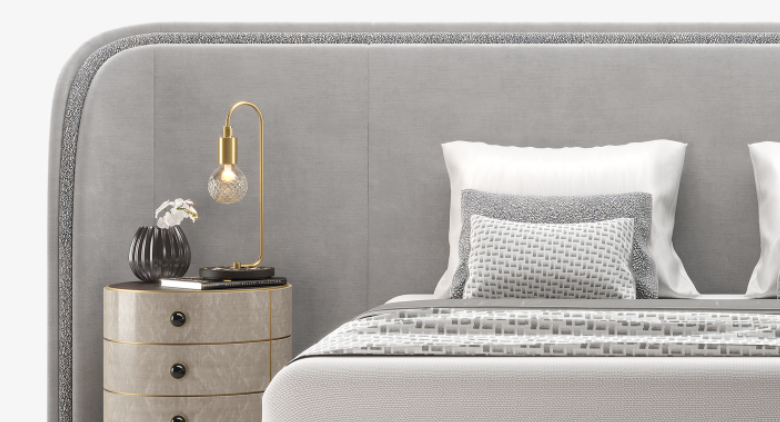 The chic CALABRIA Bed plays with the concept of a room within a room, theatrically defining the sleep space with its oversized, upholstered headboard, which is large enough to not only enclose the low-level platform bed, but also two nightstands.
