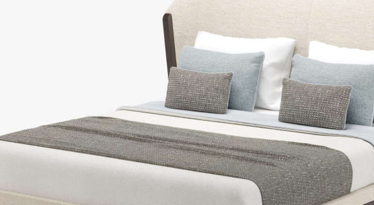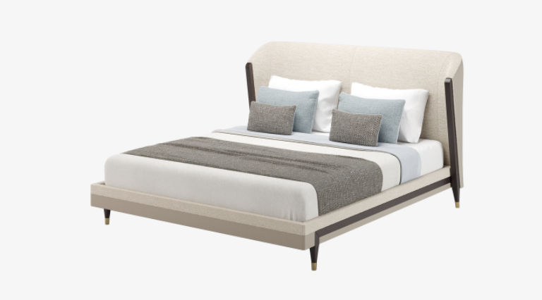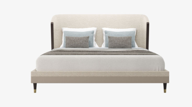 Fully upholstered in a cotton-based fabric, the cocooning form of the CARMEL bed promotes rest and relaxation with its gently curved headboard and linear details in exotic wood veneer, while eye-catching metallic accents add flair to the feet.