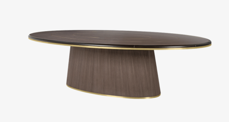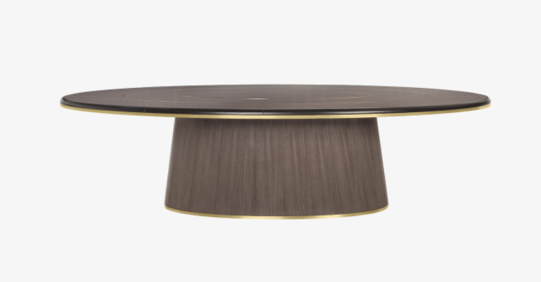 A symphony of oval shapes, the BREMEN dining table features a substantial pedestal base and an elongated top that reaches 280 centimetres in length. Fashioned out of wood veneer, embellishments include a series of brushed-brass ovals that echo outwards across the surface.