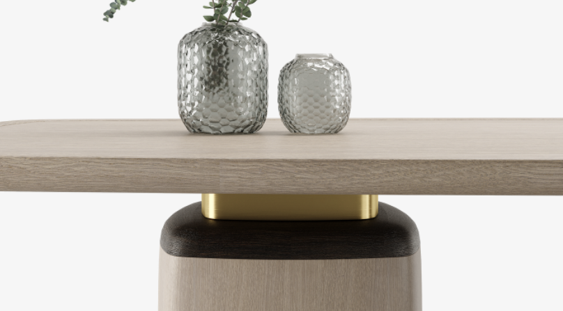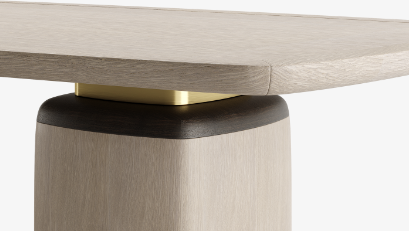 The majestic NAGANO dining table takes its moniker from the Japanese city, which is renowned as a hub of spiritual sites and natural splendour. Predominantly finished in soft grey wood veneer its embellishments of darker wood and brushed brass amplify the dining table’s stately silhouette.