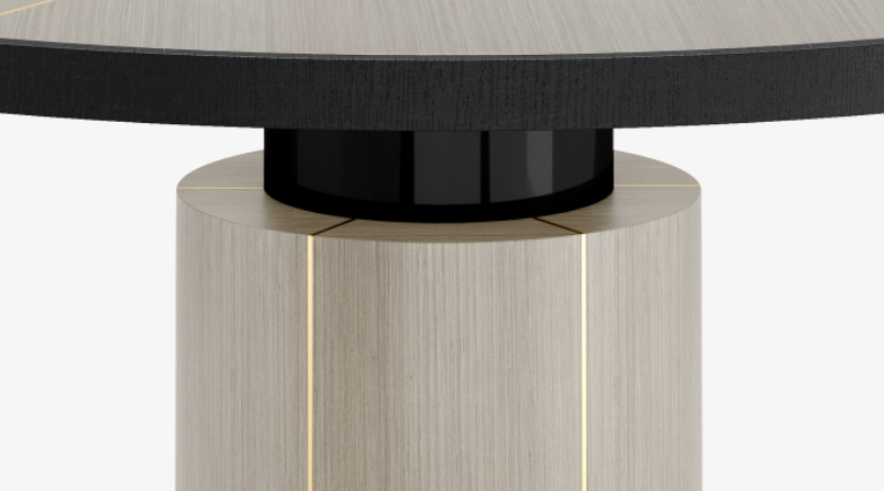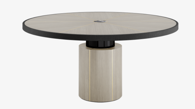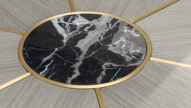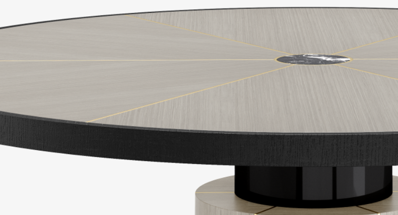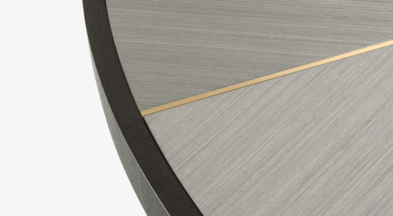 "Blending a stone centre with seams of brushed brass and sections of wood veneer, the surface of the RAIPUR Dining Table brings a touch of the extraordinary to everyday dining. WIDTH: 1600mm DEPTH: 1600mm HEIGHT:760 mm
