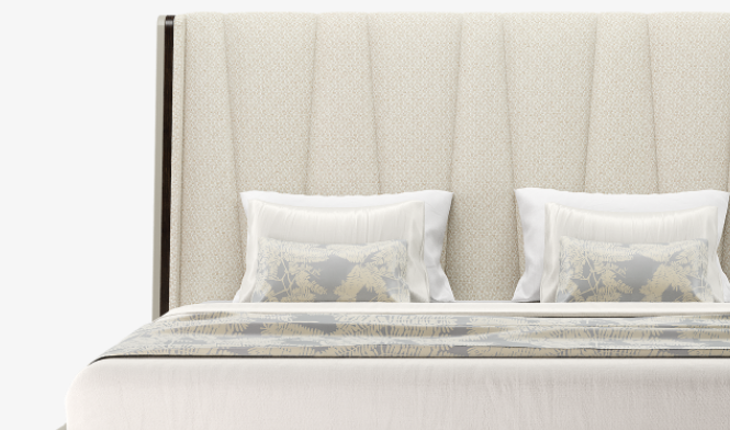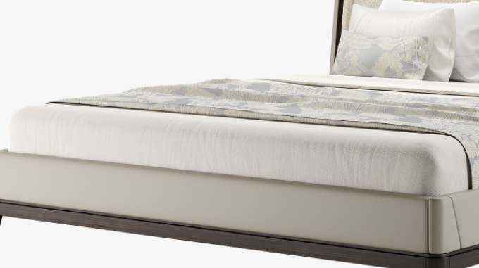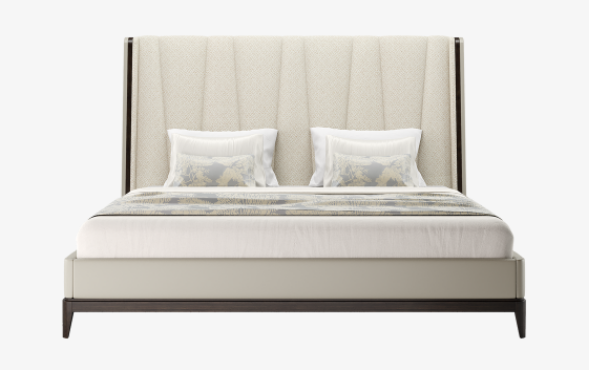 An oversized, upholstered headboard, tailored to form a tasteful V-style pattern, gives the elegant NANTES bed its statement look. This is encased in a creamy leather-covered exterior that sits over a simple, four-legged base in contrasting dark wood veneer.