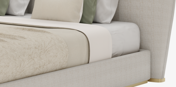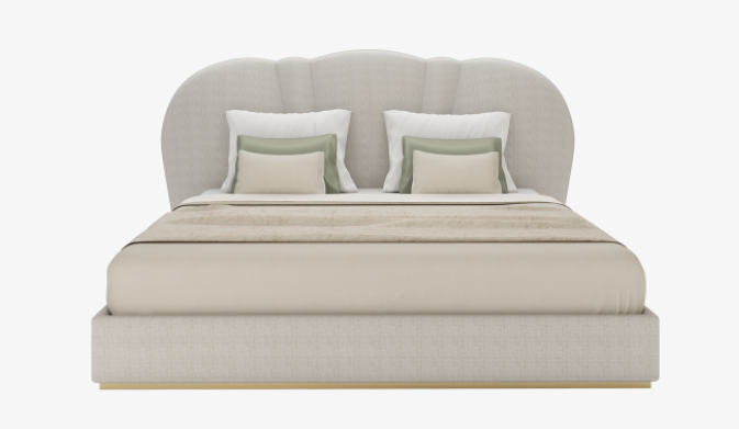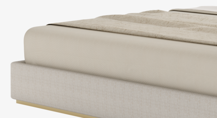 "Clean lines and sweeping curves combine in this sumptuous SAMARA bed, which draws on Art Deco style to infuse its statement design with a timeless quality. Upholstered in a soothing natural shade, the bed sits atop a brushed brass base, exuding warmth and luxury. "
