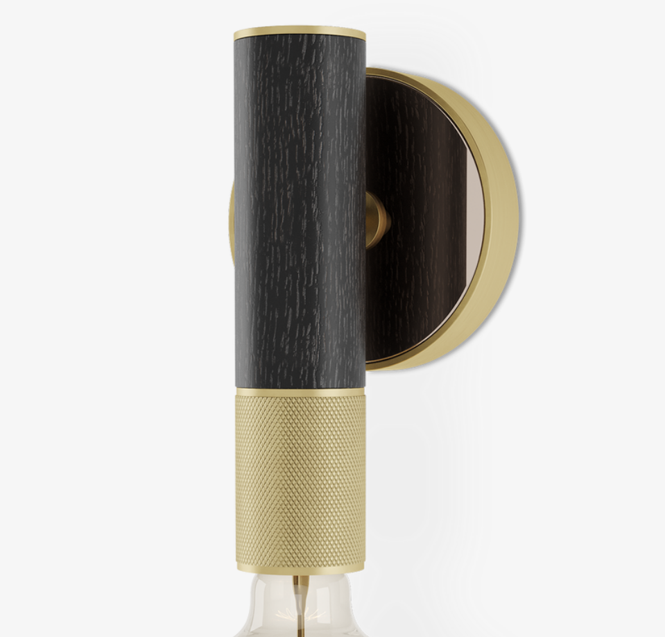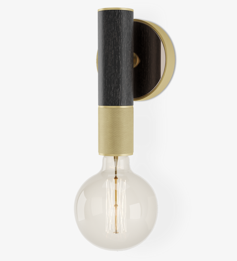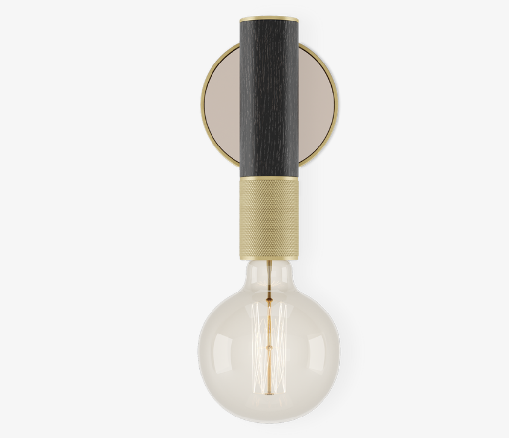 The pared-back form of the ASPEN wall lamp combines industrial influences with decorative qualities. Featuring a naked bulb, the generously proportioned structure blends a medley of solid wood, bronze mirror and brass.