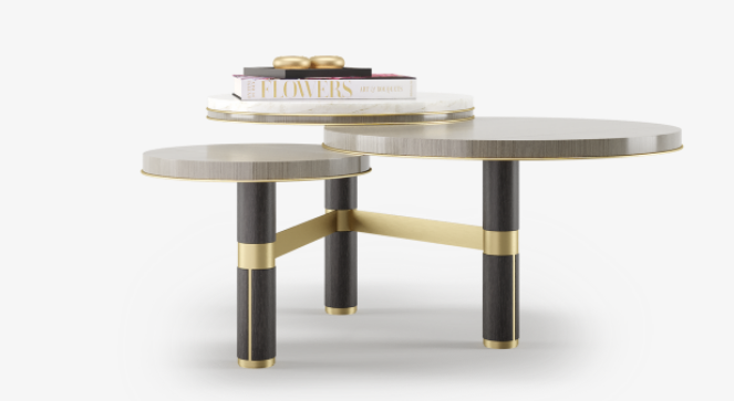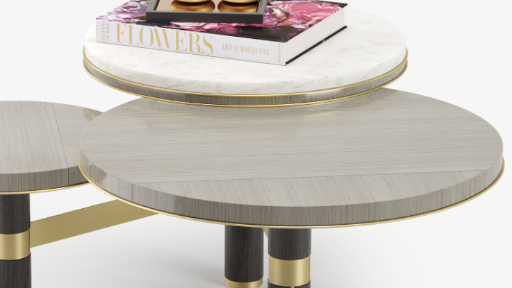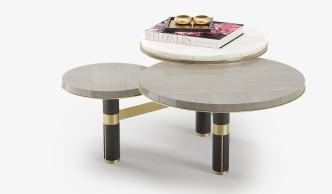 Featuring a medley of different materials (stone, glossy veneer, solid wood, brushed brass) and a trio of overlapping surfaces, the striking CHARLESTON coffee table will bring a jazz-like rhythm to any space. Position where its intricate form can be fully admired.