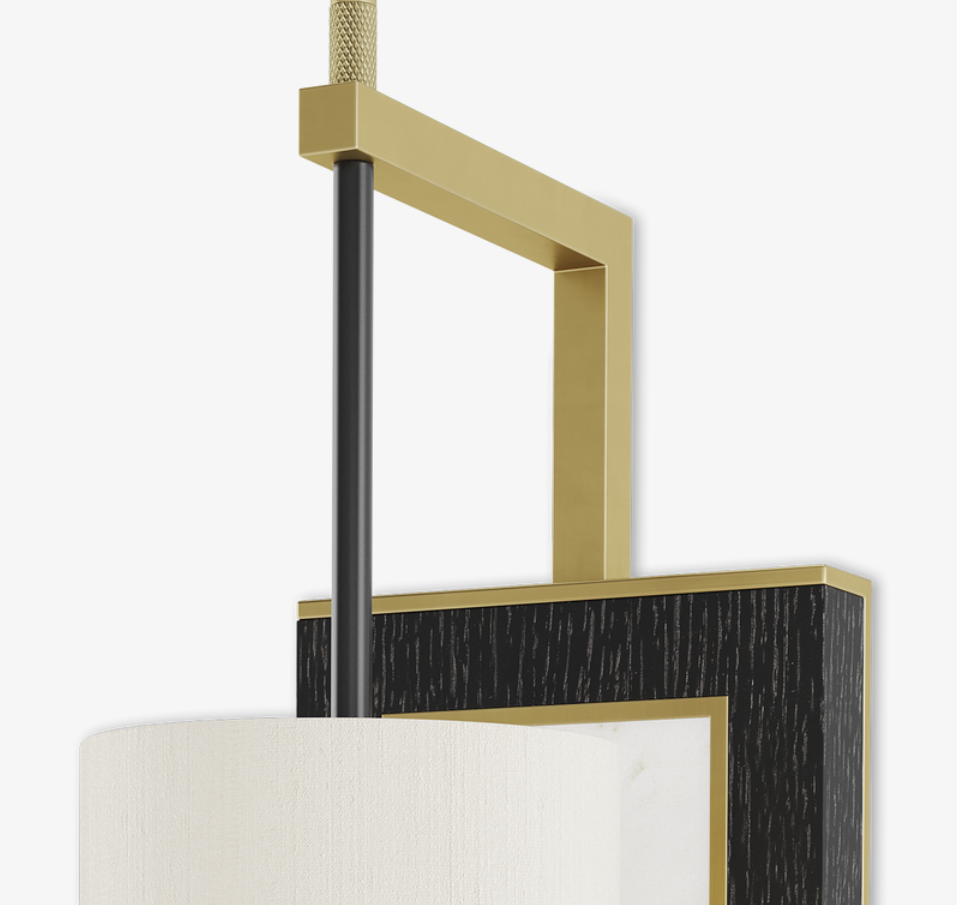 Free up bedside space with a wall-hung lighting design such as the KASSEL lamp, which features a back panel of wood veneer, brass and stone, and a cylindrical shade in double silk.