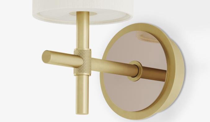 Serving timeless style and understated glamour, the refined VIENNA wall lamp features a cylindrical double-silk shade with diffuser and a pared-back structure of brushed brass elevated by an inset circle of bronze mirror.