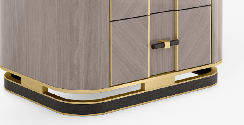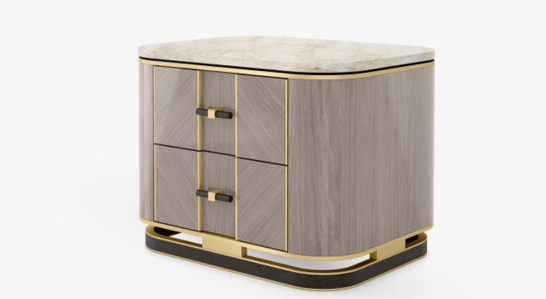 The ASHI Bedside Table is brimming with character. A curved cube crafted from wood veneer, its two suede-lined drawers are opened with sculptural handles of solid wood and brushed brass. Further details include a framework base and stone surface that’s cool to the touch.