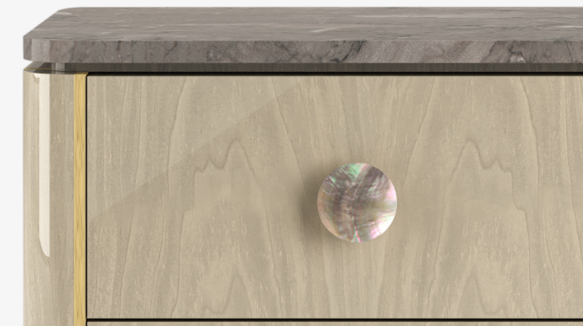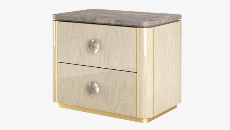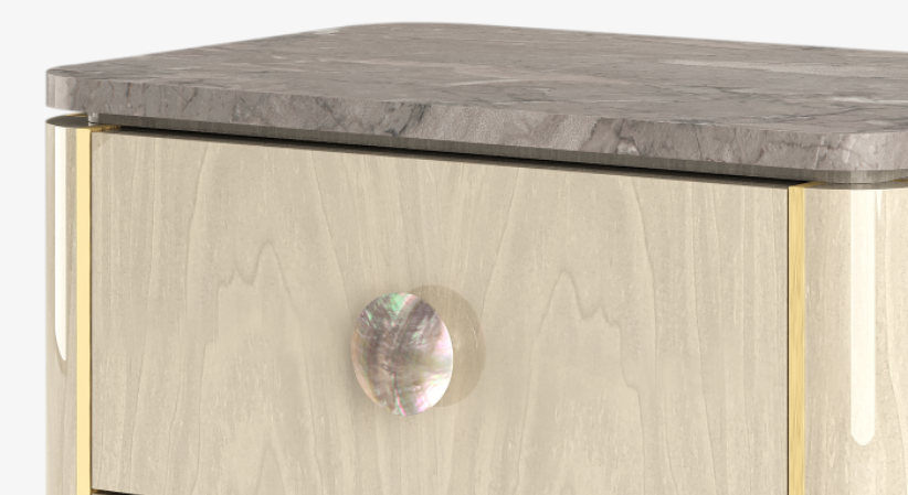"The BERNA Bedside Table takes a timeless design and elevates it through the application of unexpected materials and details. Stone and wood veneer introduce patina, brushed-brass details provide definition and black mother-of-pearl handles add finesse. "