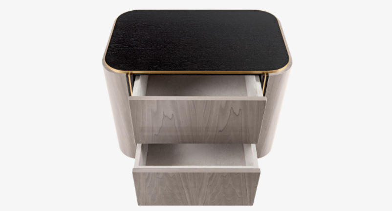 A curved cube, the sleek KENT Bedside Table features two suede-lined, handle-free drawers outlined in dark wood veneer and brushed brass. These stand out against the design’s grey veneer facade, creating a H-shaped pattern to the front.