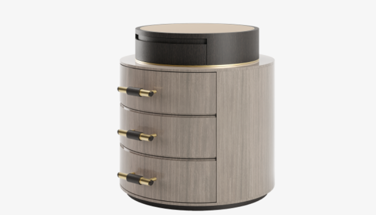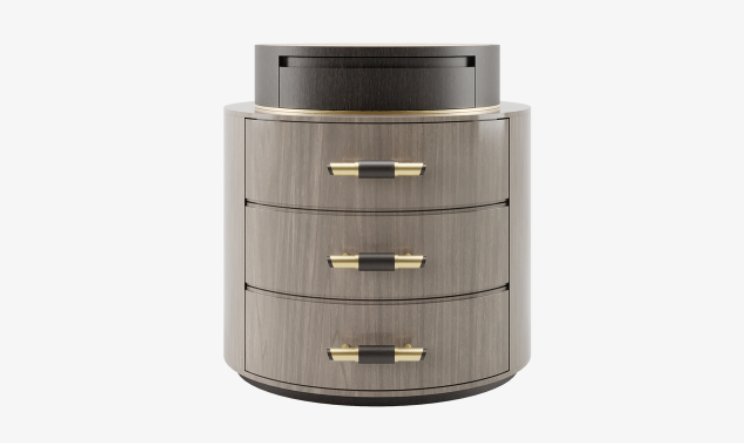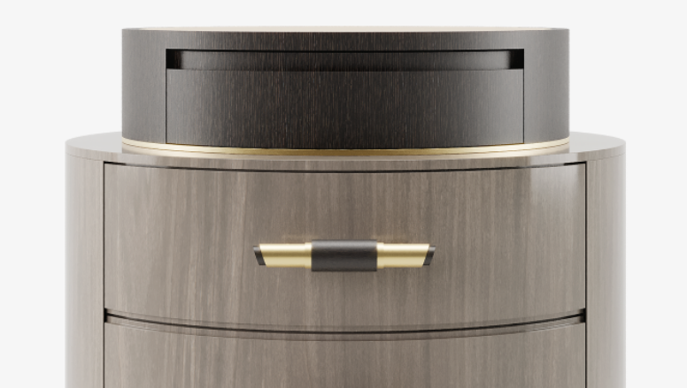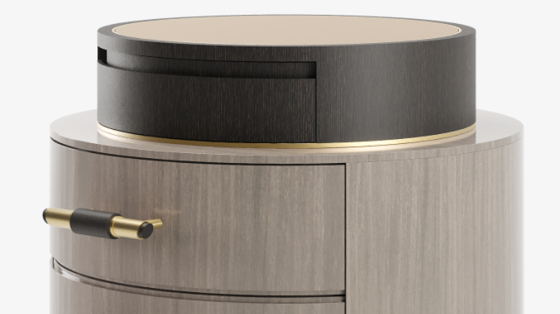 A sleek circular design featuring three suede-lined drawers, the wood veneer and brushed-brass TULSA bedside table has an ace up its sleeve: a surface pedestal topped with bronze mirror. Accessorise with a complementary table lamp and it will playfully reflect light around your sleep space.