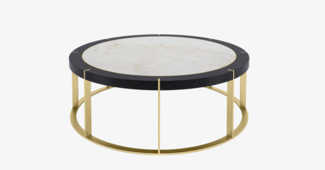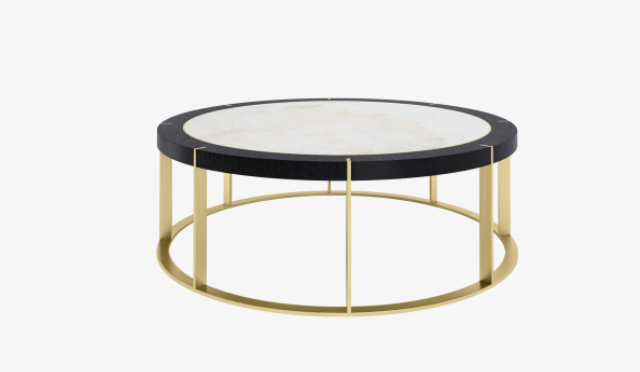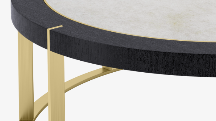 The drum-shaped design of the PRAGUE coffee table features a circular metal base and eight slimline legs. These slice though the outer edges of the surface, which features a stone centre surrounded by rings of metal and wood veneer.