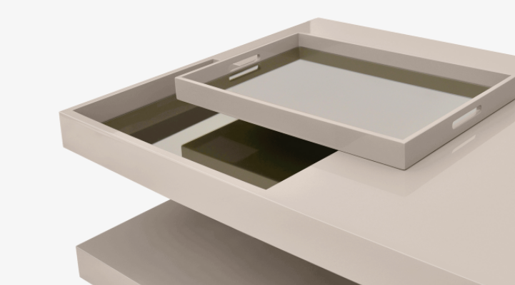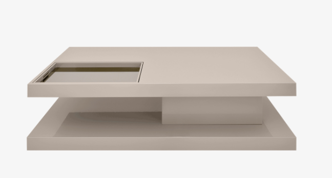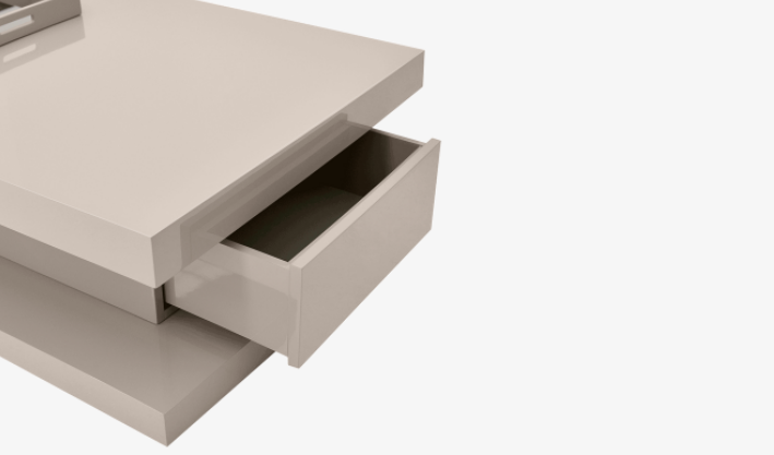 Inspired by modernist architecture, the lacquered wood SALDANHA Coffee Table includes a few surprises. The cantilevered surface, which incorporates a removable tray, hovers over the base and is braced by a recessed section that conceals a secret drawer.