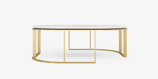 The stone top of the TARTU Coffee Table is layered over a slice of recessed lacquered wood, which creates an idiosyncratic section of shadow between the design’s surface and brushed-brass framework, which appears perfectly symmetrical or quirkily offset depending on the viewing angle.