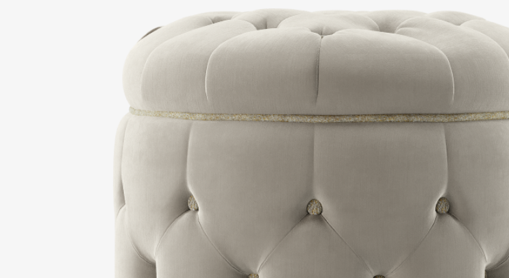 Traditional button detailing adds a pleasing plumpness to the LA SCALA stool, which can be upholstered in any of the exquisite fabrics from FRATO’s material library.
