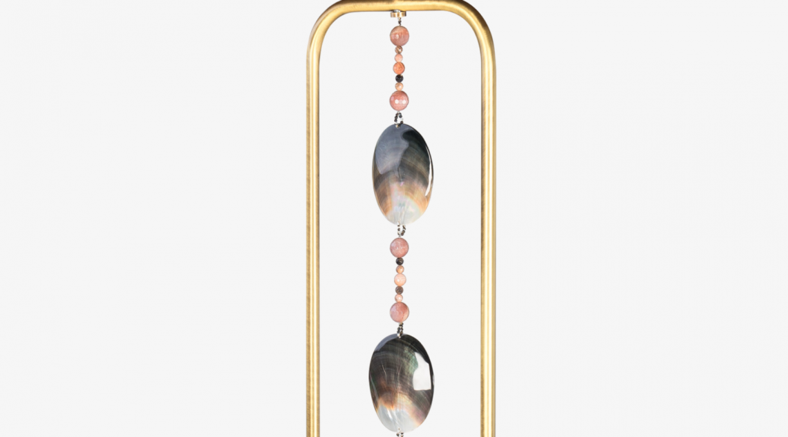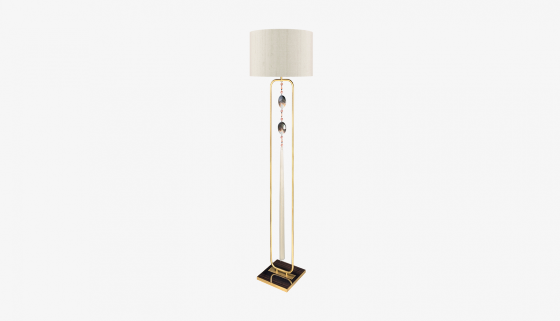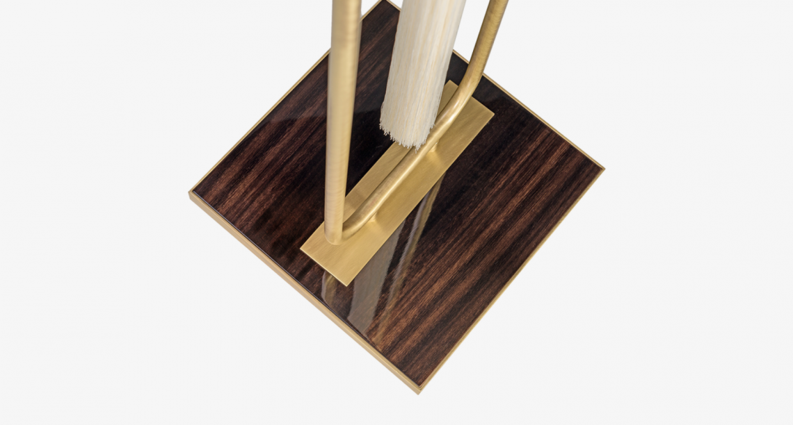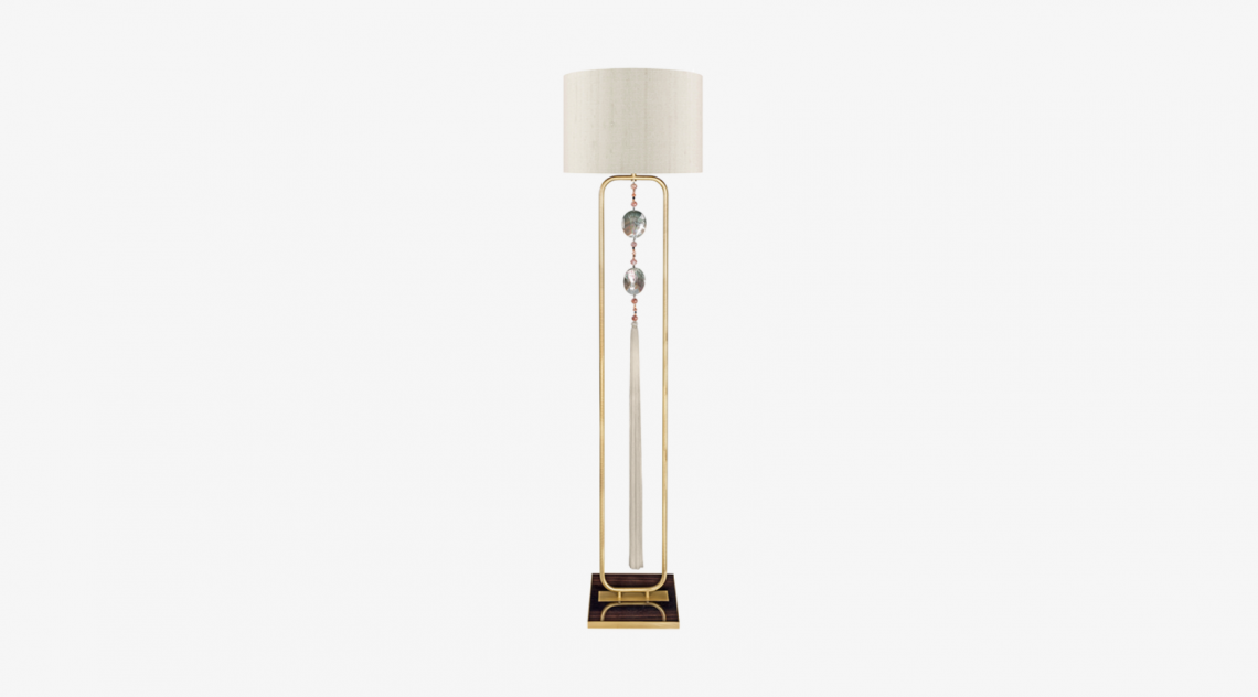 The LAOS floor lamp conveys an international flavour thanks to its tasselled pendant. This complements the double-silk drum shade and adds an ornamental touch to design's brushed-brass frame and wood veneer base plate.