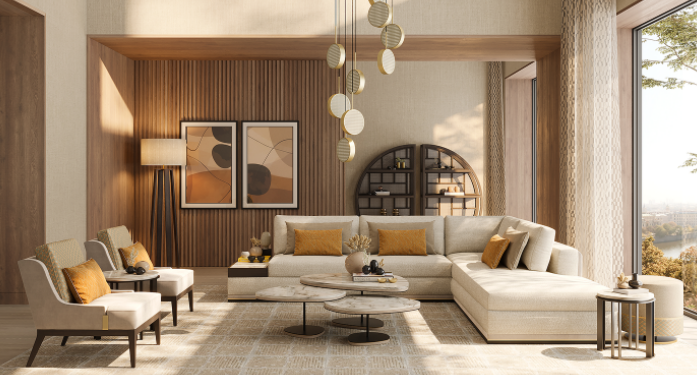 Blending a modern, clean-lined silhouette with laidback, loose-fit cushions, our HIDDEN HILLS sofa's signature creamy-coloured upholstery incorporates cotton, linen and velvet, which contrast beautifully with elements of exotic wood, brushed brass and Calacatta marble.