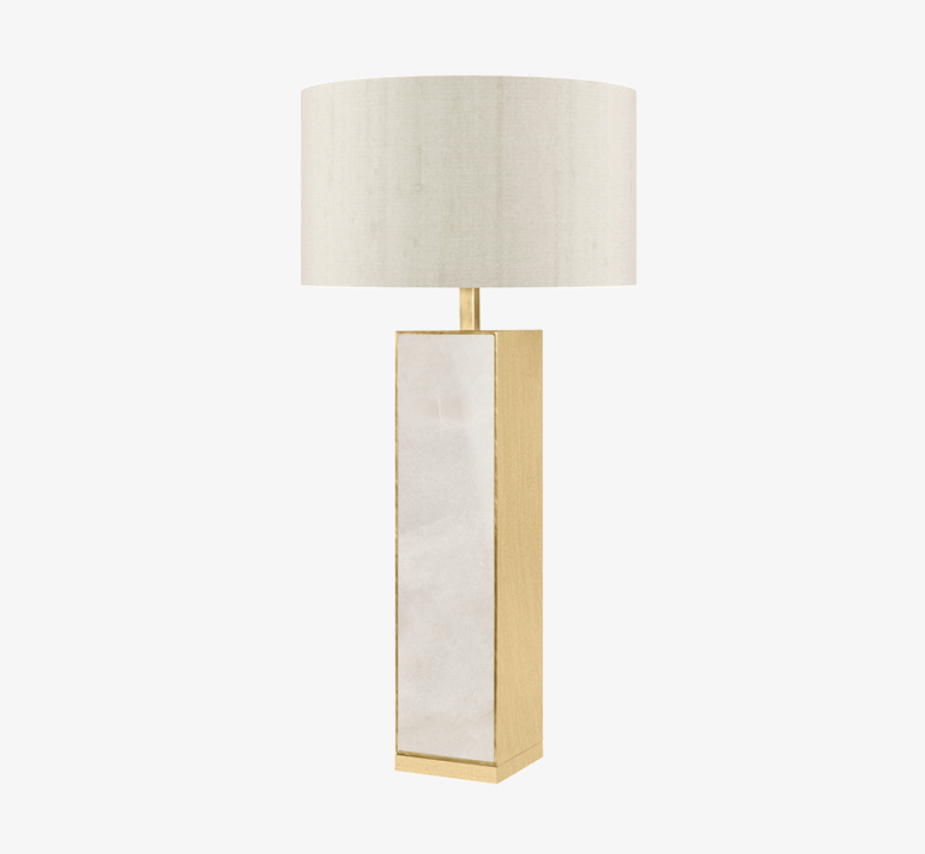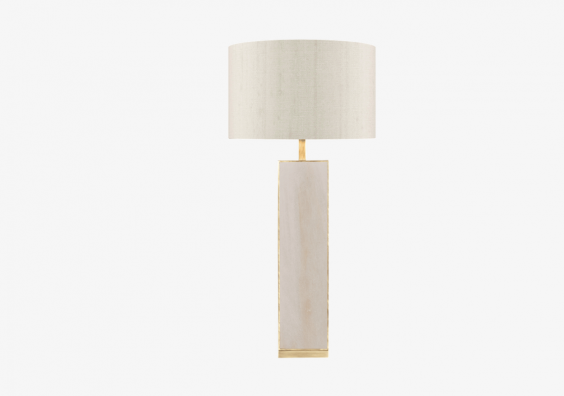 Variegated stone adds dynamism to the brass base of the BIARRITZ Table Lamp, which is topped with a drum shade in textured double silk.