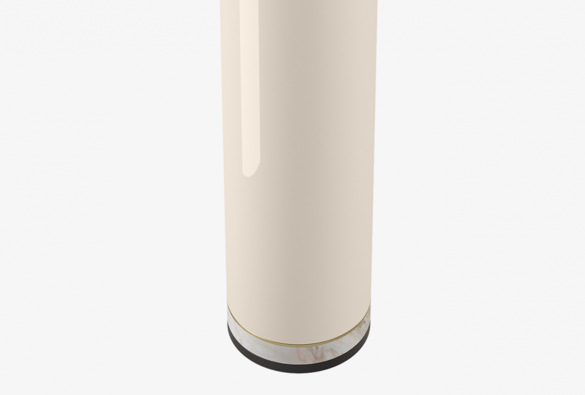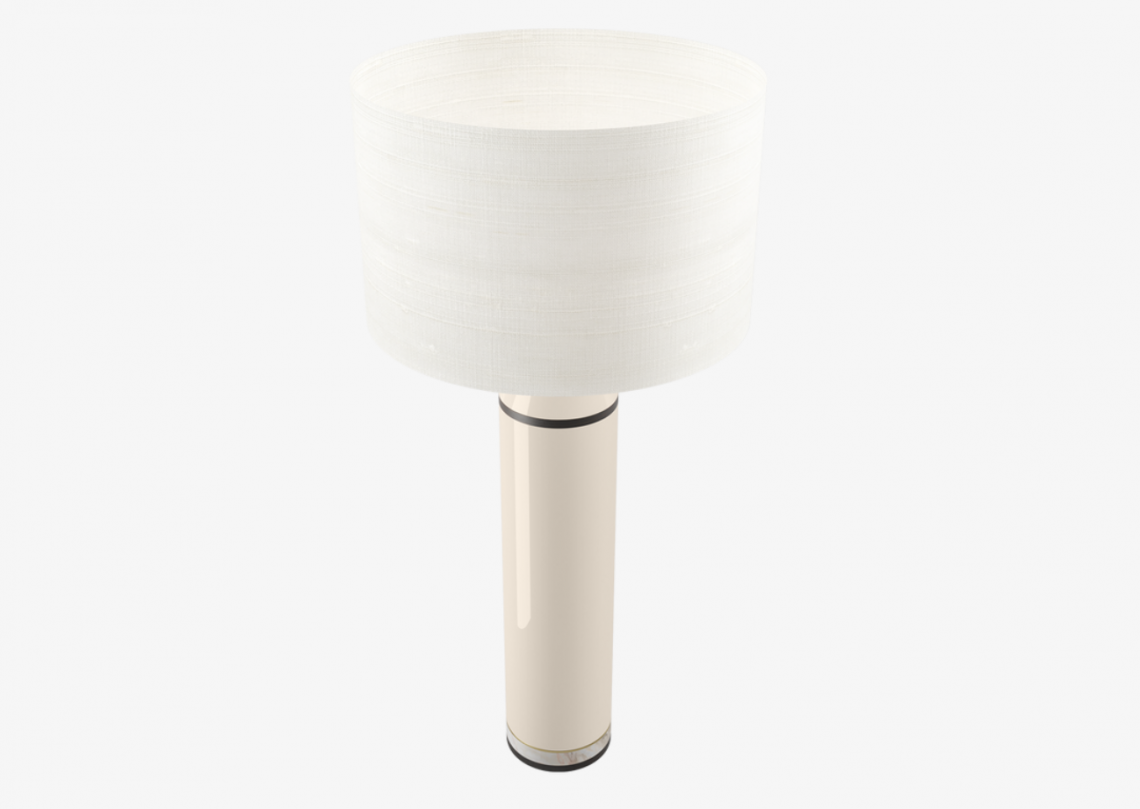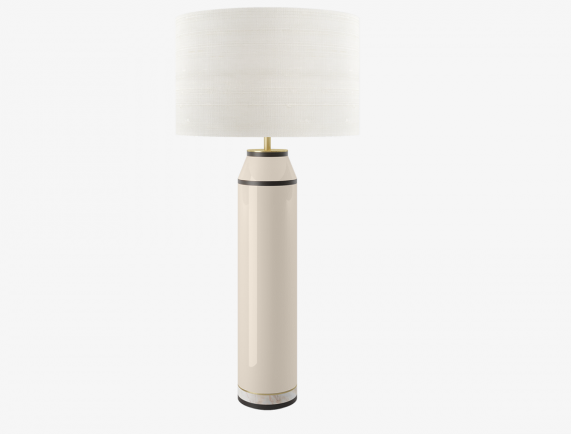 Contrasting sections of brushed brass, wood veneer, lacquered wood and stone form the base of the CACERES Table Lamp, which is topped off with a fabric drum shade.