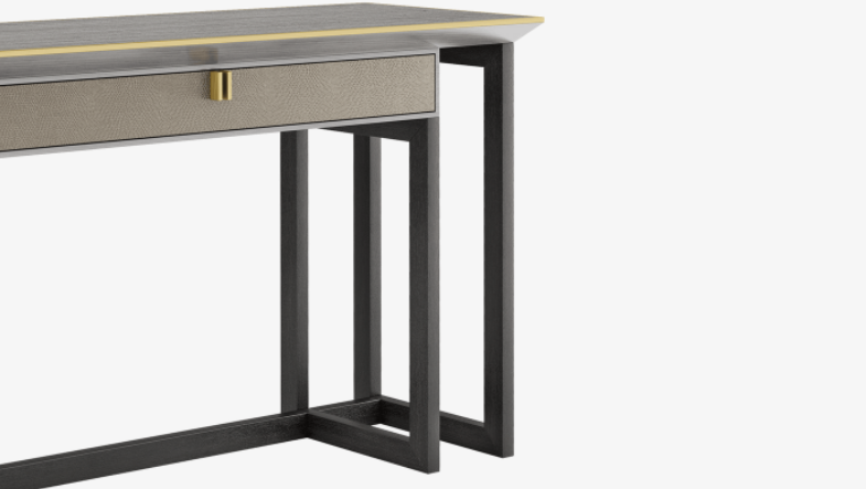 An avant-garde take on a design within a design, the innovative BALI console incorporates a wood veneer box drawer with leather front and suede interior, a wood veneer surface, brushed brass handles and seams, plus a solid wood framework.