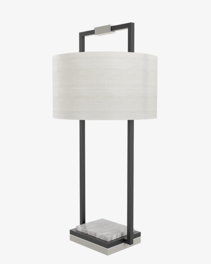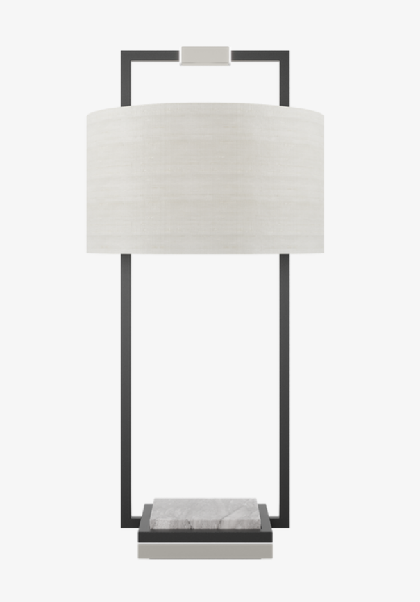 A structural fusion of stainless steel, stone and lacquered wood topped with a fabric shade, the CORFU Table Lamp brings luxe materiality to a refined silhouette.