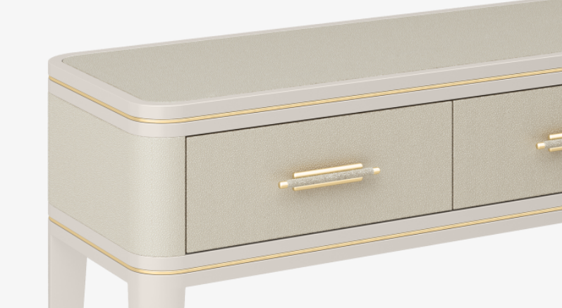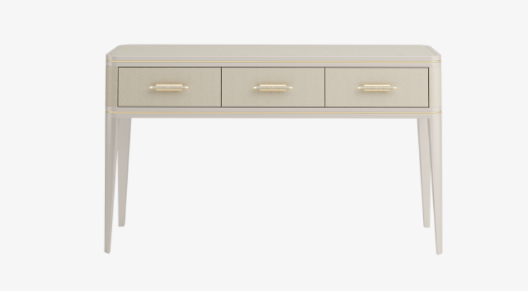A classic design through and through, the elegantly proportioned CLICQUOT console incorporates a trio of drawers and long, tapered legs. An exquisite blend of leather, lacquered wood and brushed brass, it showcases the of pure elegance neutral hues.