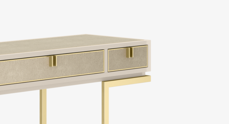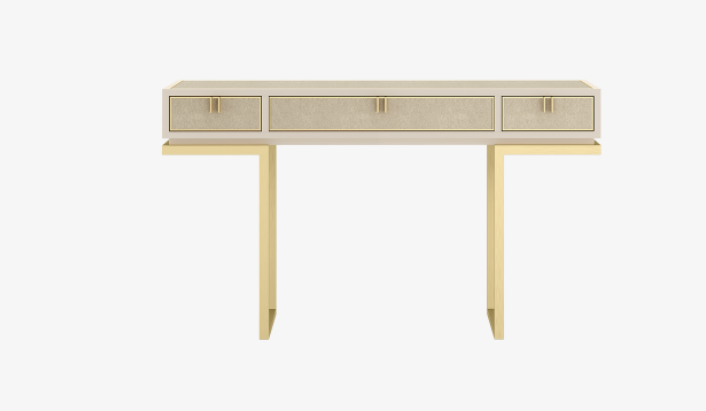 When it comes to this console, the DEVILLE is in the detail. Notice how the three drawers and surface are finished in leather, how the metal edging and handles echo the material and form of the substructure, and how the base of the lacquered box is recessed to add a sense of lightness.