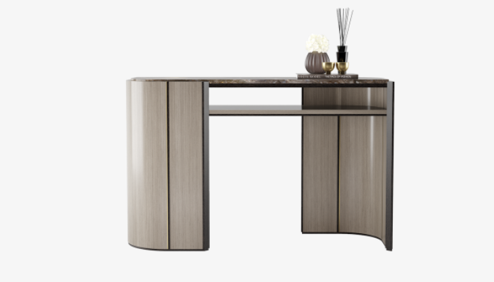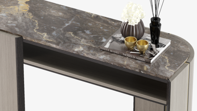 "Overlapping forms and sinuous curves add interest to the alluring OKAYAMA console, which layers different shades of solid wood and veneer to define its silhouette, while beautiful black stone run through with a rich white vein adds interest at the surface. "