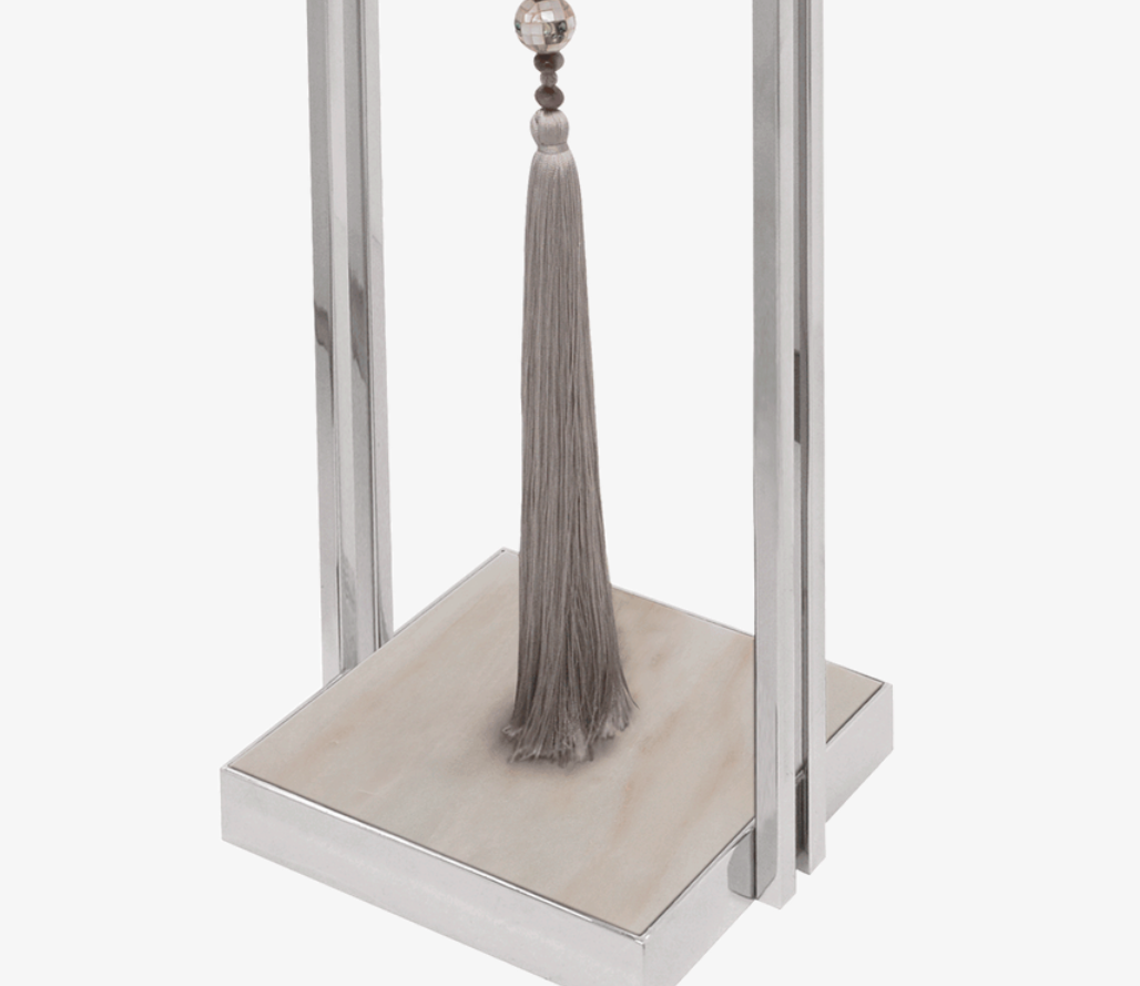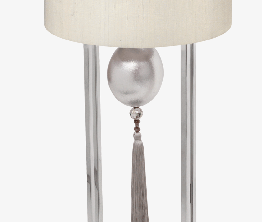The proportions of the SOUL table lamp give this design a real sense of presence. A framework of stone and polished stainless steel supports a double-silk shade, below which hangs an ornamental pendant that introduces a sense of movement to the design.