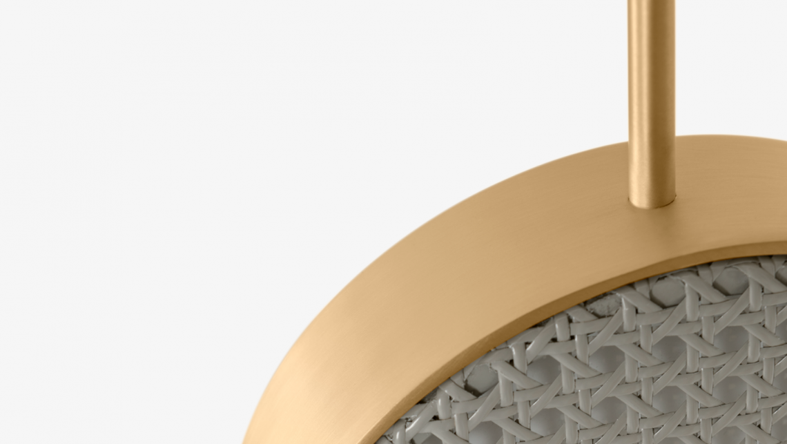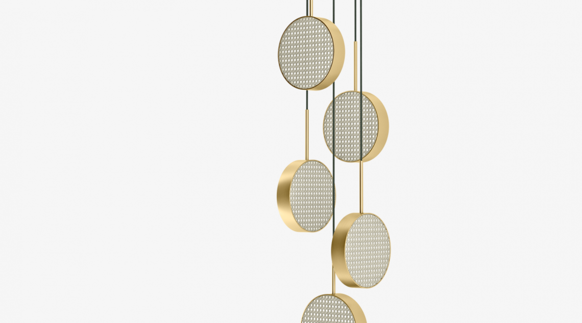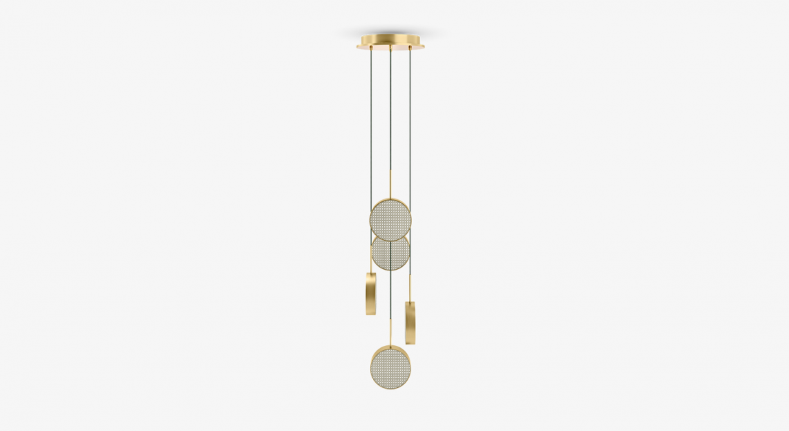 The KYOTO ceiling light is made up of five brushed-brass discs, each inlaid with decorative rattan fretwork that creates attractive shadow play when illuminated