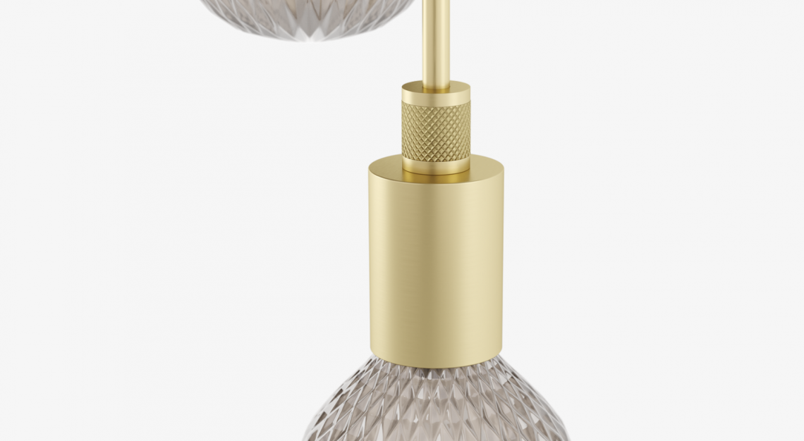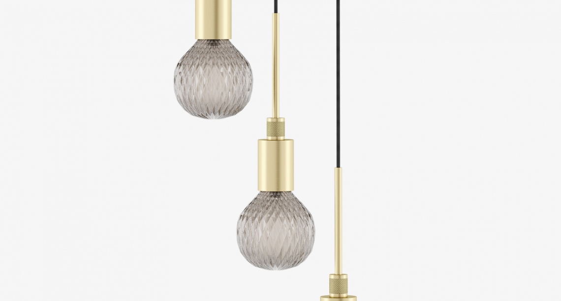 The brushed-brass TAKI ceiling lamp features a cascade of traditional-looking cut-glass bulbs that, when illuminated, cast shimmering patterns of light.